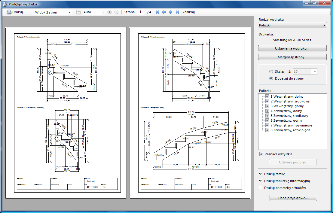 Rys.: Okno programu z ustawieniami schodów zabiegowych Rys.: Okno wydruku z rysunkami policzków bocznych